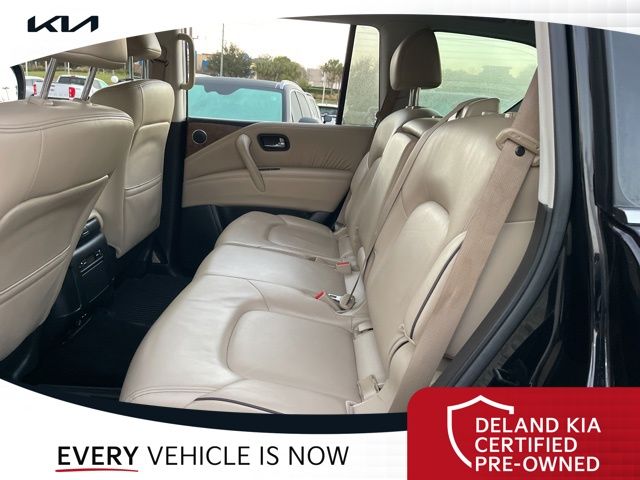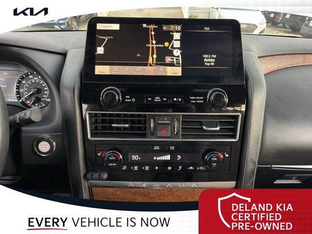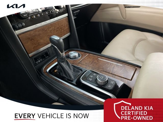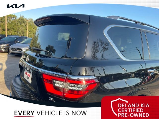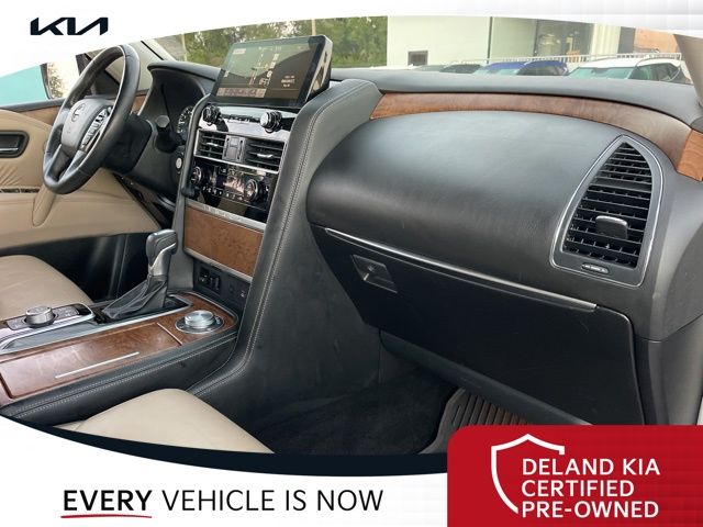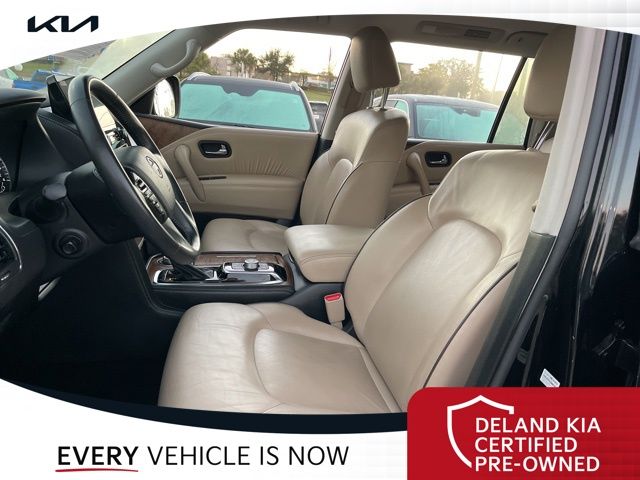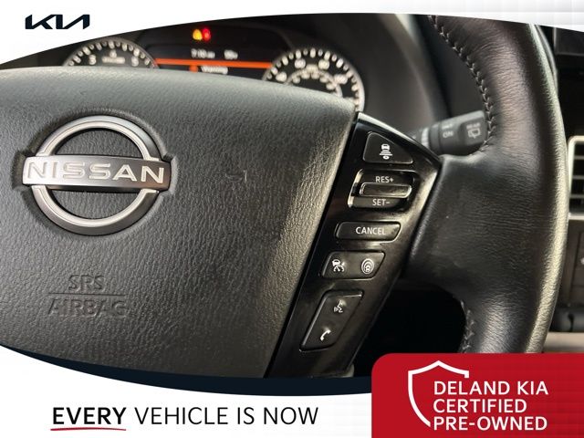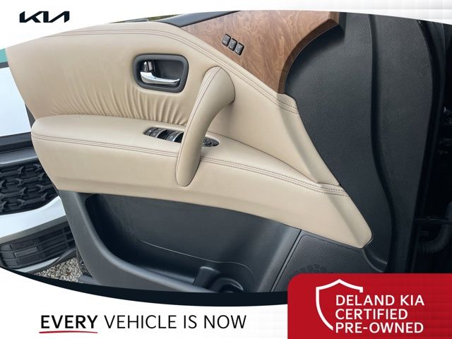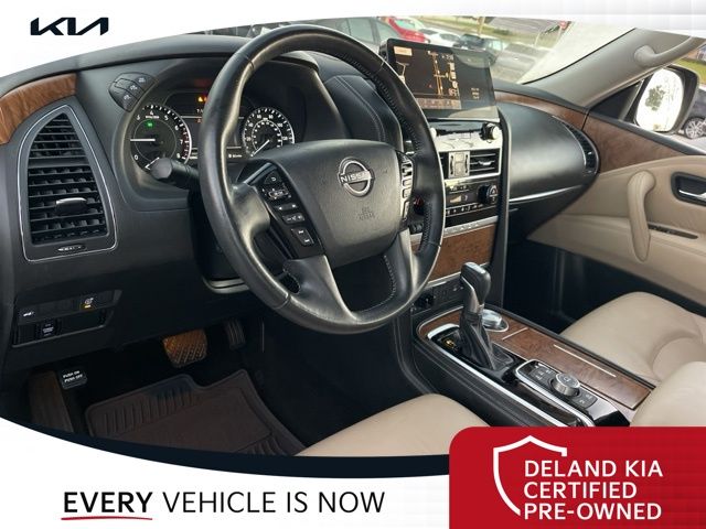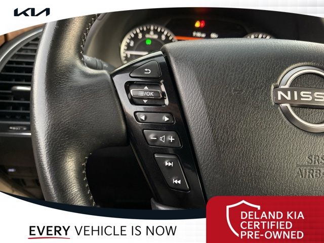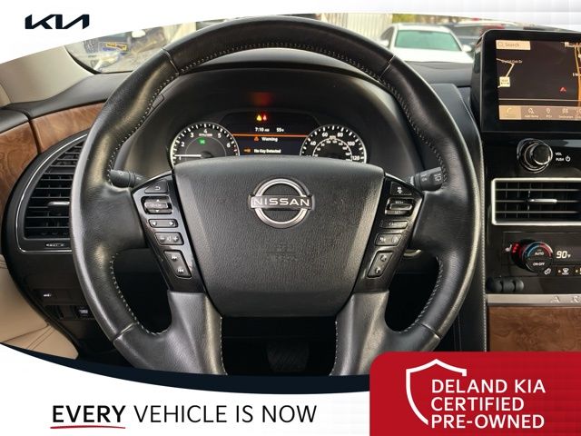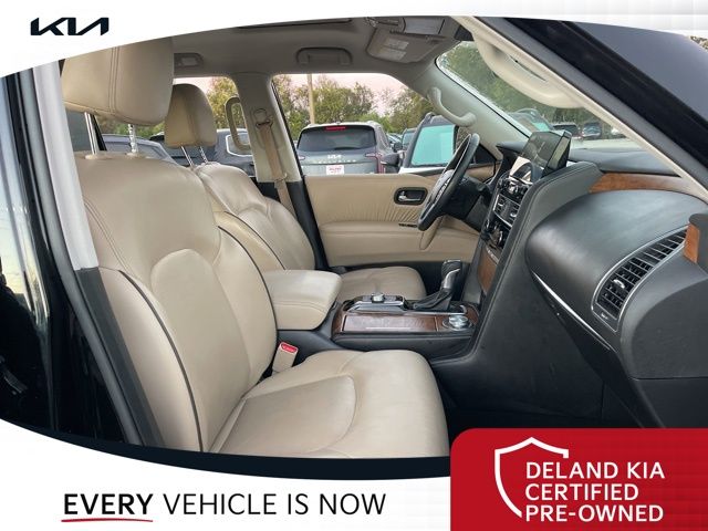 Equipped with 4WD, Alloy wheels, Auto-dimming Rear-View mirror, Front dual zone A/C, Heated front seats, Memory seat, Power Liftgate, Power moonroof, Power passenger seat, Rear air conditioning, Reclining 3rd row seat, 13 Speakers, 2.94 Axle Ratio, 3rd Row Carpeted Floor Mats - Bench Seat, 3rd row seats: split-bench, 4-Wheel Disc Brakes, ABS brakes, Air Conditioning, AM/FM radio: SiriusXM, Anti-whiplash front head restraints, Auto High-beam Headlights, Auto tilt-away steering wheel, Auto-dimming door mirrors, Auto-leveling suspension, Automatic temperature control, Brake assist, Bumpers: body-color, Delay-off headlights, Driver door bin, Driver vanity mirror, Dual front impact airbags, Dual front side impact airbags, Electronic Stability Control, Emergency communication system: NissanConnect Services, Exterior Parking Camera Rear, Four wheel independent suspension, Front anti-roll bar, Front Bucket Seats, Front Center Armrest, Front fog lights, Front reading lights, Fully automatic headlights, Garage door transmitter: HomeLink, Heated door mirrors, Heated Front Bucket Seats, Illuminated entry, Illuminated Kick Plates, Knee airbag, Leather Shift Knob, Leather-Appointed Seat Trim, Low tire pressure warning, Navigation System, NissanConnect featuring Apple CarPlay and Android Auto, Occupant sensing airbag, Outside temperature display, Overhead airbag, Overhead console, Panic alarm, Passenger door bin, Passenger vanity mirror, Power door mirrors, Power driver seat, Power steering, Power windows, Radio: NissanConnect w/SiriusXM, Rear anti-roll bar, Rear reading lights, Rear seat center armrest, Rear window defroster, Rear window wiper, Remote keyless entry, Roof Rail Cross Bars, Security system, Speed control, Speed-sensing steering, Speed-Sensitive Wipers, Split folding rear seat, Spoiler, Steering wheel memory, Steering wheel mounted audio controls, Tachometer, Telescoping steering wheel, Tilt steering wheel, Traction control, Trip computer, Turn signal indicator mirrors, Variably intermittent wipers, Voltmeter, and Wheels: 20" x 8J Painted Alloy.